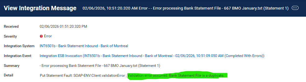 Workday checks the Statement Number field in the group header (Record 02). If you or the bank sends a file with a Statement Number that matches an existing record for that specific bank account, the connector will reject it.