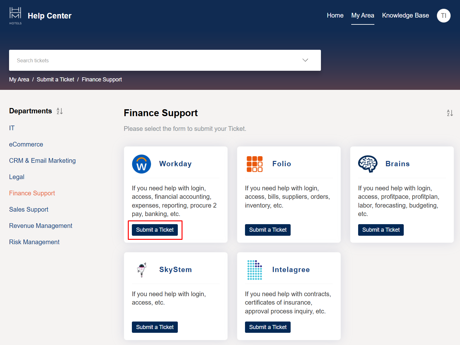 Most request categories will be found under the Workday section but you can follow the instructions below to get help for Folio, Brains, Skystem and Intelagree as well.