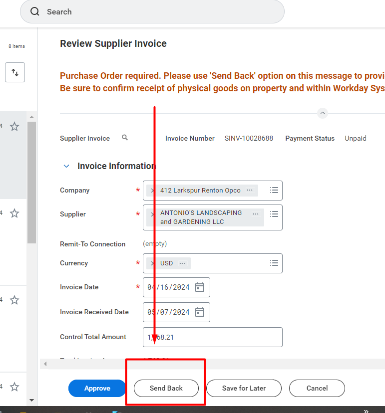 Once the PO is located or created, navigate back to the task for the invoice and use the, "Send Back" option to provide the PO number to the AP Specialist so they can process the invoice: