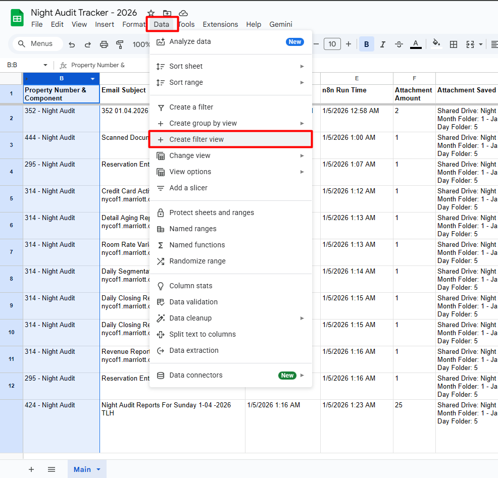 B | Property Number & Component | ASP received email for night.audit+###@hhmlp.com. Automation determines correct site & folder based on email received |