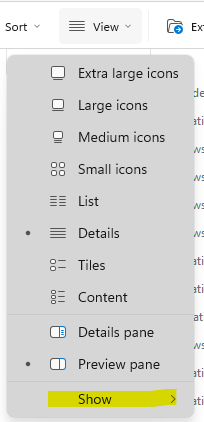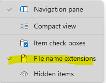 Open the folder containing your downloaded Skystem report. At the top of the file explorer window, click the View tab. Click on Show, then select File name extensions (ensure there is a checkmark next to it).