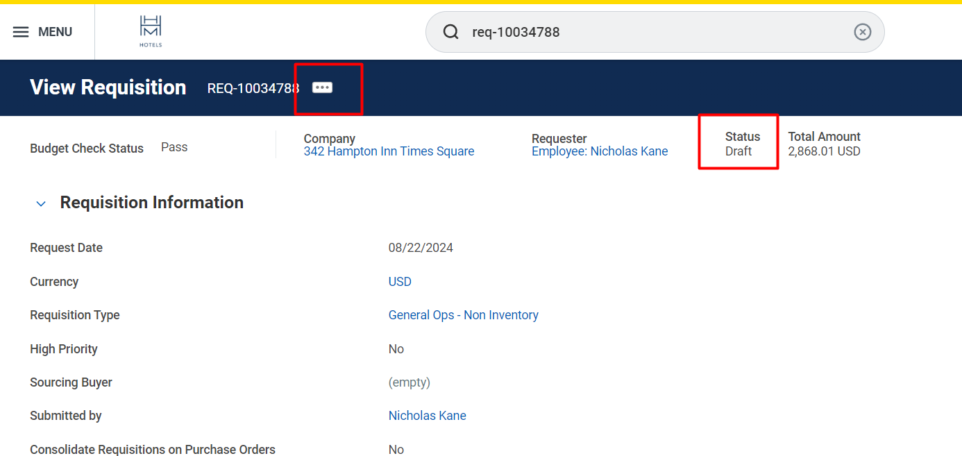 To cancel a draft requisition navigate to the Requisition and click the related actions icon next to the requisition number: Then click on requisition and then cancel: Enter a note regarding the reason for cancellation and then click OK