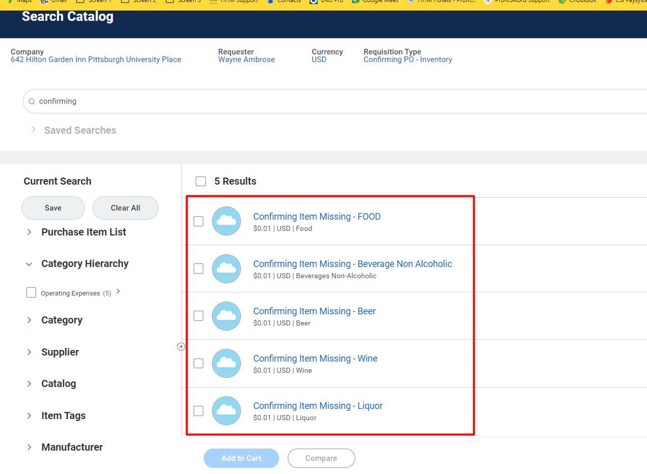 3. Clear your search filters and options and type "Confirming" in the search bar and select the item that matches the spend category for the missing item or items.