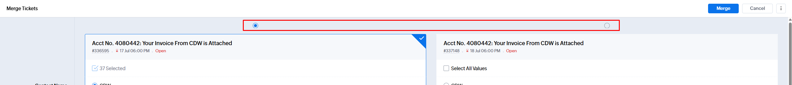 - You will be prompted to select which ticket will remain open while the other tickets threads, comments, etc - will be merged into the remaining ticket.